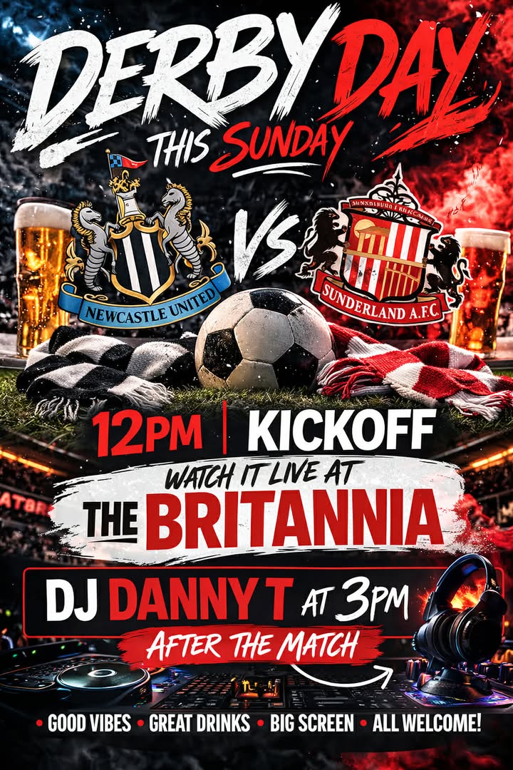 🔥 DERBY DAY THIS SUNDAY! 🔥 It’s the one we’ve all been waiting for… ⚫⚪ Newcastle vs Sunderland 🔴⚪ ⏰ 12PM KICK OFF 📍 Live on the big screens at The Britannia Get in early, grab your pint, and soak up the atmosphere for the biggest game around 🍻⚽ 🎧 DJ Danny T from 3PM – straight after the final whistle Let’s keep the party going all afternoon! 💥 Good vibes 🍺 Great drinks 📺 Big screens 🙌 Everyone welcome This place will be bouncing… don’t miss it! 👇 Tag your mates & get yourselves down! 👇