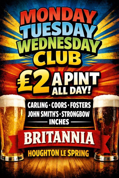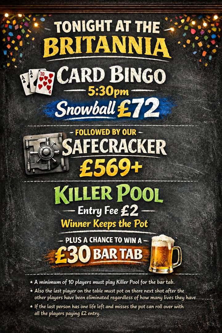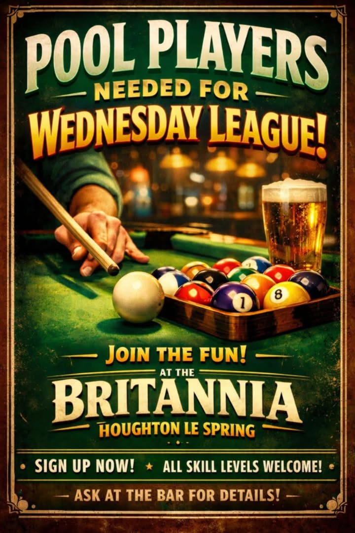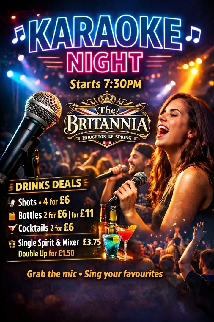 The Britannia is a fantastic community pub situated in the heart of Houghton-le-Spring! Here we offer great value for money and are your go-to place for all things sport and big weekend entertainment. Enjoy pool tables, dart boards, and cheer on your favourite teams with your perfect pint in hand! We can’t wait to see you soon!