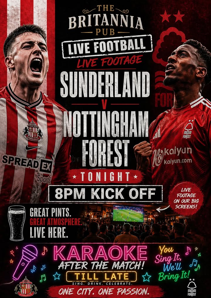 π₯ TONIGHT AT THE BRITANNIA PUB π₯ β½ LIVE FOOTBALL ON THE BIG SCREENS π₯ Sunderland v Nottingham Forest β° 8PM KICK OFF πΊ Great pints. Great atmosphere. Match night done right. π€ KARAOKE AFTER THE MATCH TILL LATE Sing your heart out and keep the night going! π The Britannia Pub Bring your mates and get in early for the best seats! #Sunderland #livefootball #karaokenightt #PubNights #MatchDay #britanniapub @followers